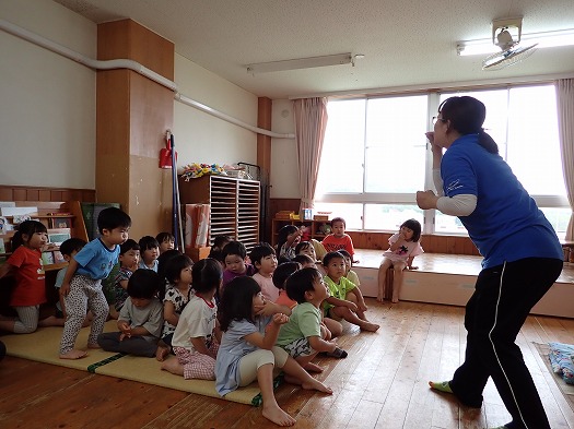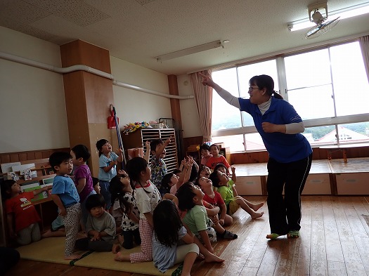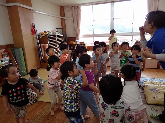 2024年07月18日 見えないしゃぼん玉 3歳児 つき 朝の集まり後に保育者が見えないシャボン玉をとばしました。 こどもたちはいつとんでくるのか、ジーっと保育者を見つめています。 ジーっと見続けたことで、シャボン玉が見えるようになってきたみたいで、「あっ!」と指をさしながらとんでいるしゃぼん玉を目で追います。 そして最後にはみんなでシャボン玉をとばしてみました。 割れないようにそーっとやさしく息をふきかけます。 見えないシャボン玉がたくさんつき組の部屋にとんでいました。 こどもたちの想像力、発想力には毎回驚かされてばかりです。 一覧へ戻る