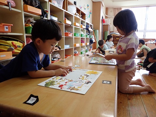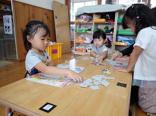 2024年07月18日 パズルに挑戦! 3歳児 つき 「パズルやりたい」「パズルだして」と、自分たちから保育者に伝えるほど、パズルにハマっています。 なかなかピースが合わず苦戦する事もありますが、回転させたり、違うピースを合わせてみたりしながら、諦めることなく最後まで取り組んでいます。 友だちがしている姿を側で見守ったり、一緒に協力して完成させることもあります。 また、「あとでかして」「いいよ」など、”順番”ということも、パズルから学んでいるようです。 一覧へ戻る