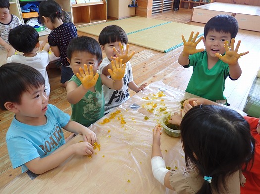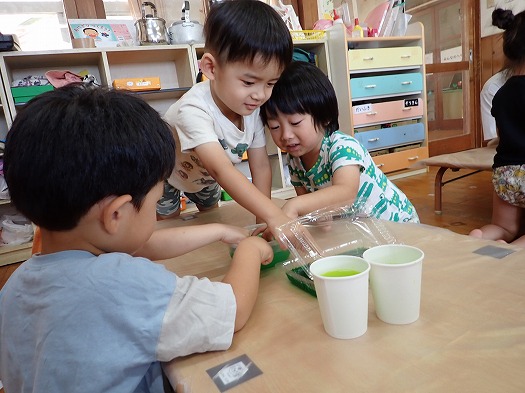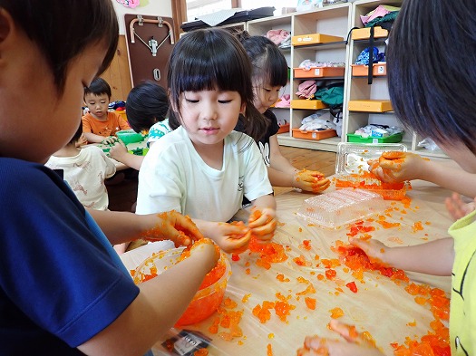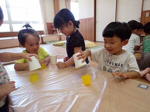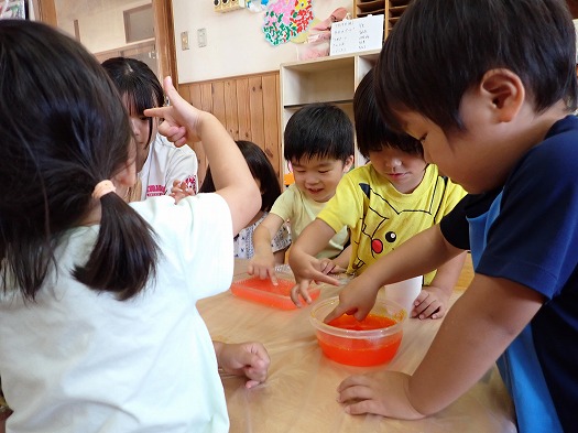 2024年07月22日 寒天で遊ぼ~ 3歳児 つき どろんこ服を着て、食紅で色を付けた寒天で遊びました。 寒天なので食べても害はないのですが、「美味しそうだけど食べないでね」と伝えて、遊びました。 最初はなかなか触ろうとしない子も多かったのですが… ちょっと触ってみよう… ツンツンツン… ゼリーみたいだね! 寒天の感触に慣れてくると、触り方もダイナミックになりました。 手に色が付いた~ 遊んでいるうちに、寒天はバラバラになっていき、最後には粉々になりました。 小さくなったね~ 一覧へ戻る