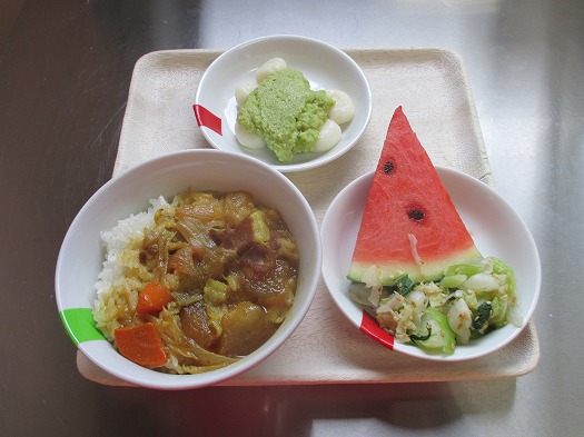 2024年07月25日 給食室(7月25日の給食、おやつ) 給食室 昼食 ・冬瓜のカレーあんかけ丼 ・キャベツのもみ漬け ・すいか おやつ ・ずんだ餅 『冬瓜のカレーあんかけ丼』の冬瓜は、今が旬! 冬の字がはいっていますが、 冬まで保存ができ、美味しく食べられるからだそうですよ。 今日は、冬瓜を使ってカレー風味のあんかけ丼を作りました。 人気でした。😊 果物は『すいか』でした。夏ですね! おやつは、旬の枝豆を使ってあんこを作り、 白玉団子にのせた『ずんだ餅』でした。 一覧へ戻る