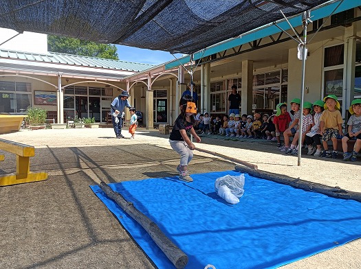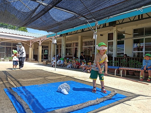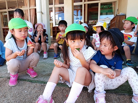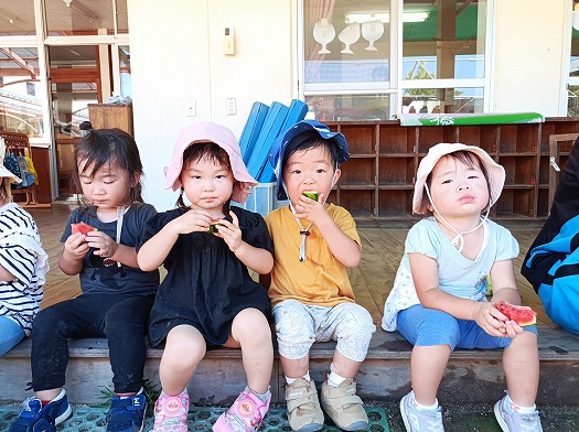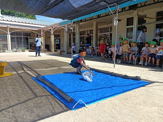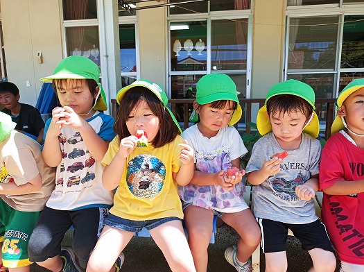 2024年07月29日 夏といえば… 2歳児 にじ 4歳児 ほし なんといってもすいかわり! なかなか丸のままで見ることも少ないすいかに興味津々のこどもたち。 「すいかだー」と大興奮でした。 見えるようにこっそりと目に穴をあけた目隠しを付けていざすいか割り。 えいっ! 割れたスイカは包丁で切ってみんなで美味しく食べました。 味の感想はこどもたちに聞いてみて下さい。 一覧へ戻る