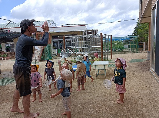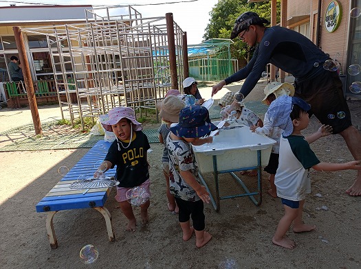 2024年07月30日 しゃぼんだまとんだ♪ 2歳児 にじ 日陰でシャボン玉あそびをしました。 今年初めてのシャボン玉あそびにこどもたちも興味津々! うちわにしゃぼん液を付けて一生懸命ふりふり。 フリフリしている子どもたちの姿がなんとも可愛いのです。 しゃぼんだままてまて~ 保育者が作ったシャボン玉をうちわを持って追いかけます! たくさんシャボン玉が出来てとても嬉しいにじ組さんでした。 一覧へ戻る