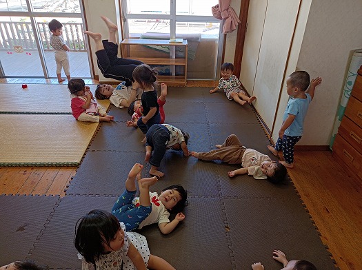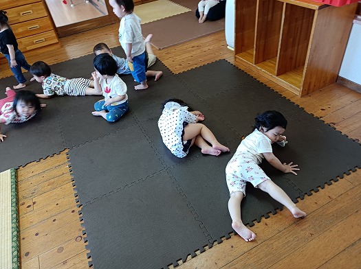 2024年08月01日 ゆきぐみリズム 1歳児 ゆき 部屋の中でリズムをしました。 普段、ホールでにじぐみ、ほしぐみのお手本を見ているこどもたちは ピアノの音を聞くと、自然と身体が動きます。 ちょっと眺めていた子も、友だちや保育者の楽しむ姿につられて 動きを真似し始める姿も。 しっかり身体を動かした後は、シャワーで汗を流してすっきりしました♪ どんぐりどんぐりご~ろごろ♪ 三輪車~! 一覧へ戻る