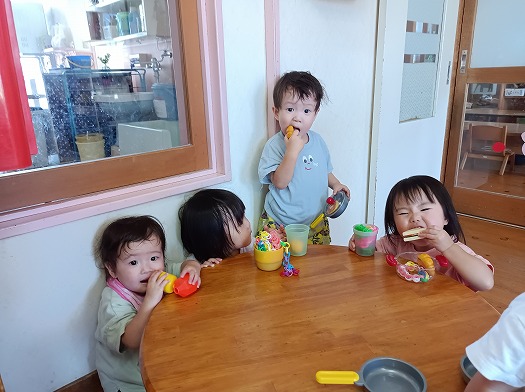 2024年08月01日 一緒におままごと 1歳児 ゆき 保育者が気付くと、テーブルの上にごちそうを並べてパーティーが開催されていました。 一緒にもぐもぐ食べる真似をしたり、友だちに「あーん」をしたり、こども同士でやりとりをしながらままごとを楽しんでいました。 その姿があまりにも可愛くて、写真をパシャリ! 「友だちと一緒に遊びたい」思いが伝わる姿に成長を感じますね。 美味しいね~! 一覧へ戻る