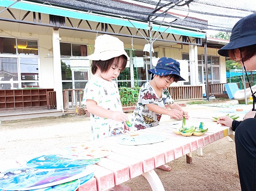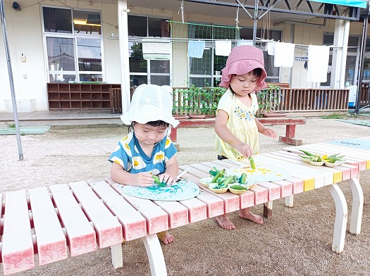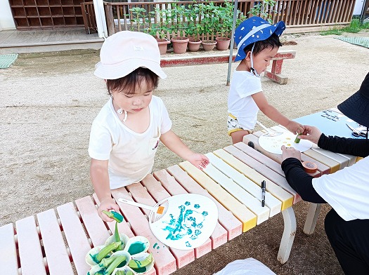 2024年08月07日 オクラスタンプで… 2歳児 にじ オクラを使ってうちわにスタンプをしました。 色々なオクラを用意して、自分でどのオクラにするか選びました。 このおくらにしよーっと。 両手で慎重に押してみたり、軽快にポンポンっと押してみたり。 そーっとそーっと。 しっかり握っておしてみようー ステキながらのうちわができていました。 しっかり乾いたら、また次のお楽しみが待っています☆ 一覧へ戻る