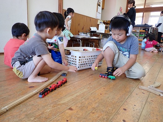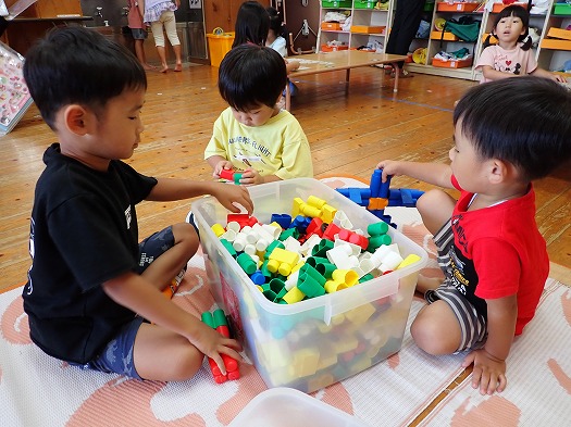 お兄ちゃんたちがどんなあそびをしているのか気になる様子で、あそび方を見たり、真似して作ってみたりしていました。