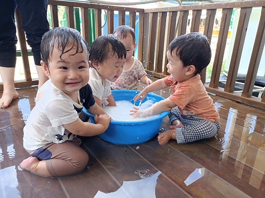 タライの中に絵の具を入れると、少しずつ色が変わっている水を見て不思議そうに見つめるこどもたち。