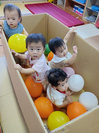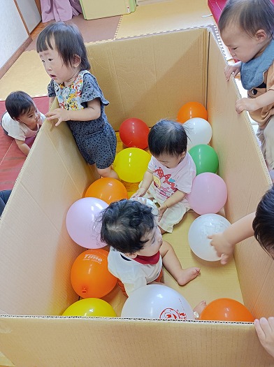 中を覗くとたくさんの風船が!順番に入って風船プールを楽しみました♪