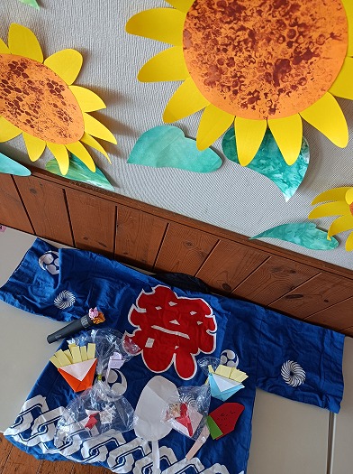 つき組(ポテト)ほし組(わたあめ・アイス)そら組(金魚すくい)の出店があり、エプロンと三角巾でバッチリ決めたこども店員さんが接客していました。