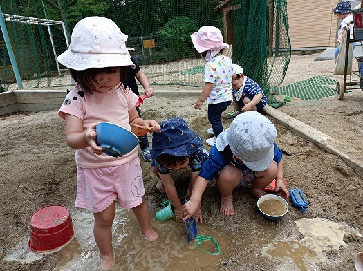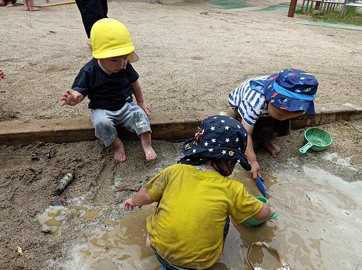 2024年08月29日 どろんこ納め 1歳児 ゆき 今年度最後のどろんこあそびを楽しみました! 砂場に水を出して、大きな水溜まりを作ると、お風呂のように入ってまったり。 お皿を並べて、泥でごちそうを作ってままごとをしたり、 出来上がった料理を「どうぞ」と振舞ってくれたりと、 優しいこどもたちです。 全身どろんこになっても気にせず、中には水溜りに寝転ぶ子も! 美味しいスープ作ってるよ! 思いっきり遊んで、どろんこあそびを納めました♪ 水の中冷たくて気持ちいい♪ 一覧へ戻る