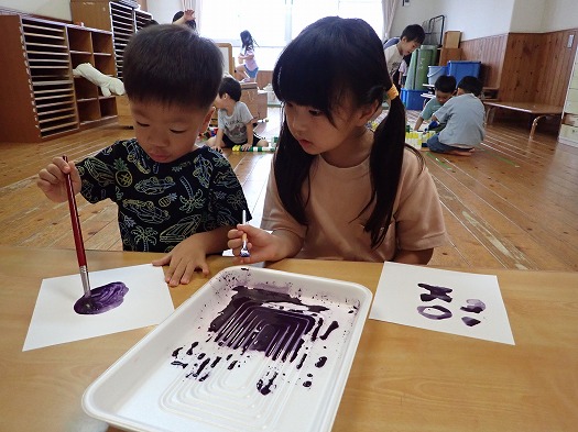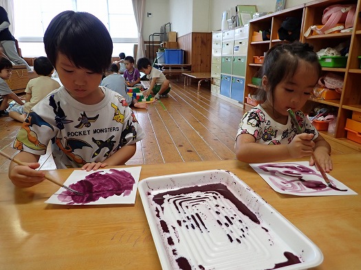 2024年08月31日 筆を使って! 4歳児 ほし 筆を使って、白い紙に絵の具で絵を描いたり、色を塗ったりしました。 白い部分がなくなるまで色を塗る子、車など好きな絵を描く子、絵の具の色が紫だったので色から連想してぶどうを描く子もいました。 いつもはクレヨンを使うので筆を持って描くことが嬉しかった様で、「楽しかった~」という声もたくさんありました。 一覧へ戻る