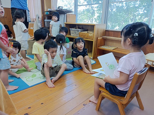 2024年09月02日 小さな先生 2歳児 にじ ある日の一コマ。 トイレ後にござに集合したとき、まだ保育者が居なくてこどもたちだけで過ごしていました。 すると…保育者が座っていた椅子にAさんが座り 「りんごりんごりんごのほっぺ~♪」と手遊びを始めました。 するとござに座っているこどもたちも真似っこをして手遊びを! 手遊びが終わると絵本まで用意してくれていました。 毎日保育者のしていることをよく見ているなと感じつつ、ほんわかする保育者でした。 一覧へ戻る