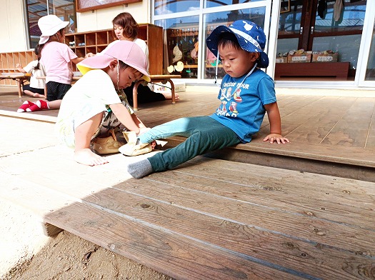 2024年09月10日 クラスを越えて 2歳児 にじ 3歳児 つき 戸外に出るにじ組の子が、靴がなかなか履けなくて困っていると、 近くにつきぐみさんが! お手伝いをお願いすると一生懸命履かせてあげようとしてくれました。 素敵な瞬間でした! ありがとう! 一覧へ戻る