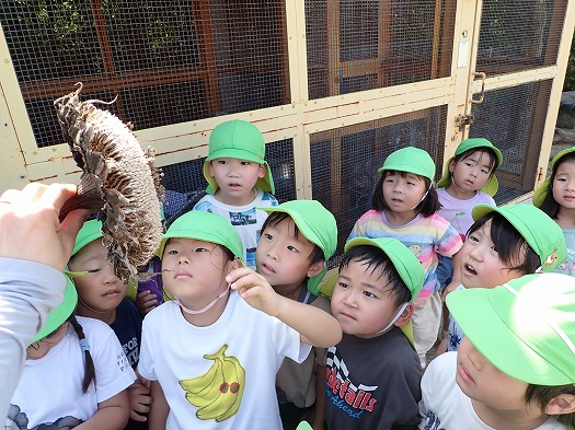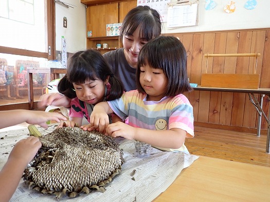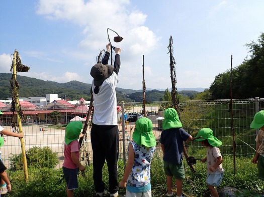 こどもたちは地面に落ちている種を拾っていましたが、「このひまわりにはもっとたくさんの種があるよ」と伝えると「え?そうなの?」と驚いていました。