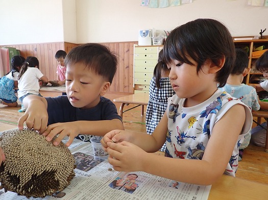 最初は1つ1つ丁寧に種を取っていましたが、何分か経ってまだまだ種があることに気づくと、ひまわりを振るなど大胆になっていました。