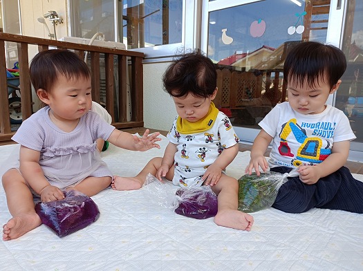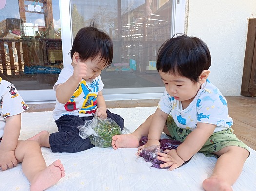 透明から紫色に!水の色が変わっていくのを不思議そうに見つめていました♪