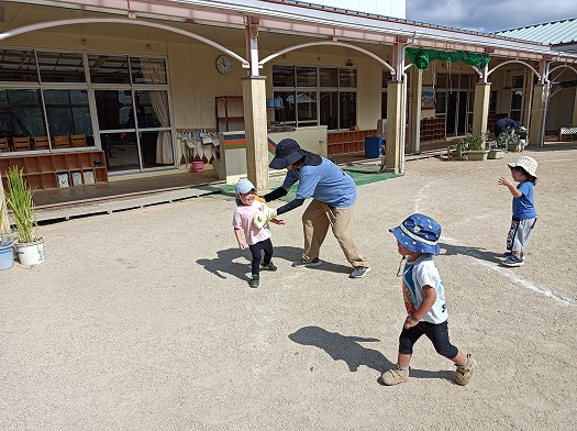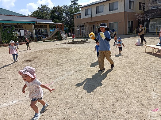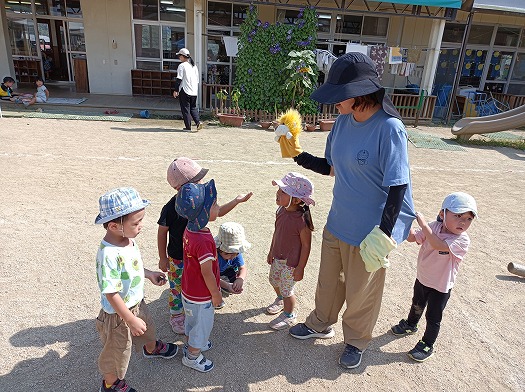 今日はにじ組に友達(ライオンとカエルのパペット)が遊びに来てくれたので、一緒に待て待て遊びをしました。