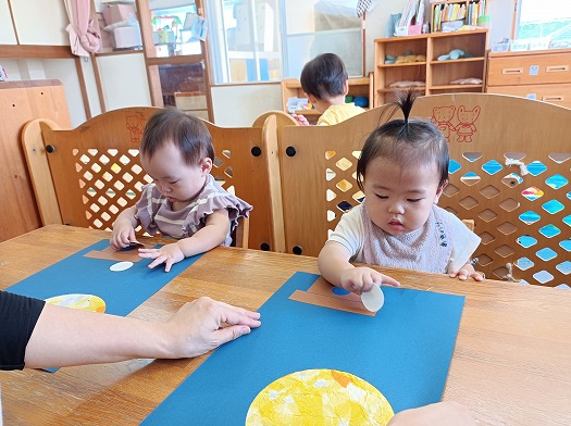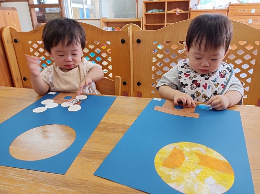 2024年09月17日 どこに置こうか? 0歳児 はな 9月はお月見! ということでお団子を貼りました。 ぺたぺた貼っていると自分で貼りたい!と言う気持ちあふれ出て、三宝からお団子がはみ出てしまう子も。 素敵なお月見だんごができました♪ 一覧へ戻る