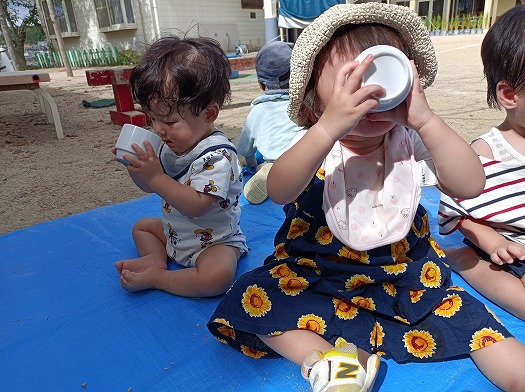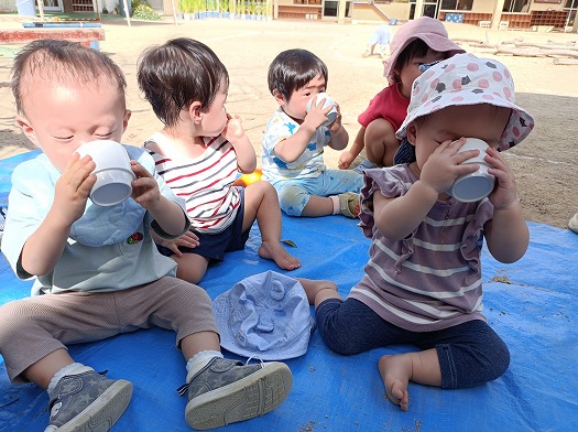 2024年09月19日 お空の下で 0歳児 はな いいお天気だったのでブルーシートを敷いてみんなでのんびり。 まだ少し暑かったのでお茶を飲みました。 自分で上手にコップを持ってゴクゴク。 ひとりでできることが少しずつ増えてきたなと嬉しく感じるひと時でした♪ 一覧へ戻る