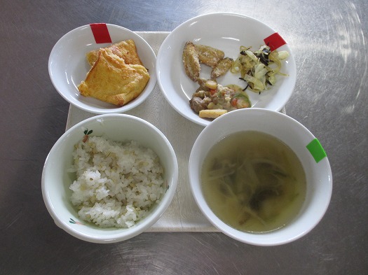 2024年09月25日 給食室(9月20日の給食、おやつ) 給食室 昼食 ・もち麦入りごはん ・八宝菜 ・フライドごぼう ・中華サラダ ・長ねぎしょうがスープ おやつ ・フレンチトースト ・牛乳 最近みんなごはんも大好きで、 いろんな変わりごはんもよく食べます。 今日の『もち麦入りごはん』もよく食べていましたよ。😊 かみかみメニューの『フライドごぼう』は、 人気メニューの1つです。 おやつは、久しぶりの『フレンチトースト』‼ これも人気でした。 一覧へ戻る