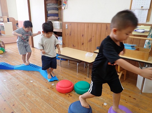 2024年09月21日 サーキット 3歳児 つき サーキットに挑戦しました。 たくさん並べられたサーキットを、バランスをとりながら進んでいきます。 時にバランスを崩しそうになっている姿もみられましたが、手を広げるなど、全身を使って落ちないように耐えていました。 身体を動かすことが大好きなこどもたちは、何度も繰り返し楽しんでいました。 一覧へ戻る
