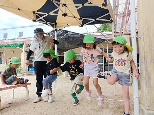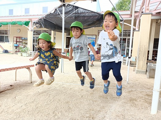 2024年10月02日 せ~の!! 4歳児 ほし ゴム跳びをしました。 グループで手を繋いでする時に「せ~の」の掛け声で息を合わせて一緒に跳びました。 跳べない子がいると、手で支えたり、ゴムを少し下げたりする姿もみられました。 一覧へ戻る