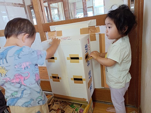 2024年10月02日 ポットン! 1歳児 ゆき ゆきぐみの部屋に、新しいポットン落としが登場しました! 初めて見る箱に、興味津々のこどもたち。 保育者が、文字積み木を穴に落とすと、下からポトンと落ちてきました。 それを見たこどもたちは、一瞬にして目がキラキラに! そこからは没頭してポットン落としを楽しんでいました♪ なんで下から出てくるんだろう?? 一覧へ戻る