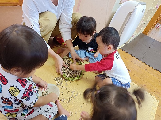 この種でひまわりの花が咲くんだよ、と説明すると、不思議そうに見つめてました。