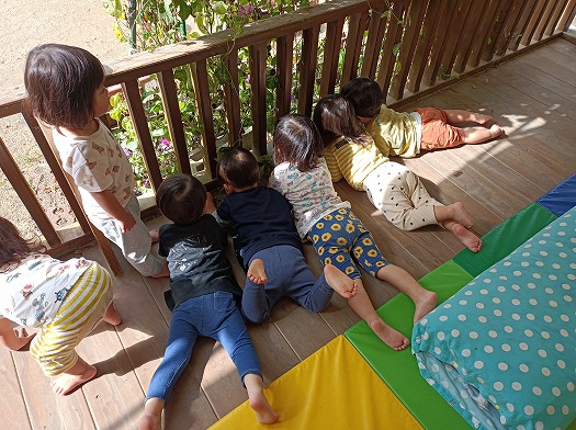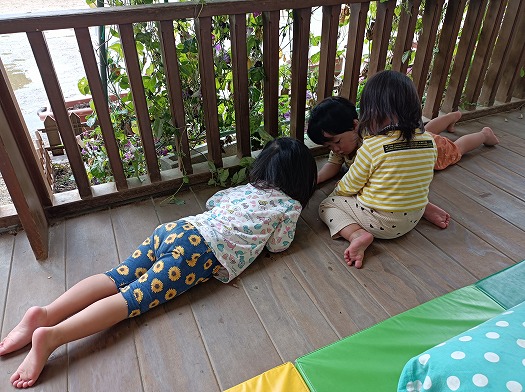 テラスの床に小さなアリを見つけた時も、数人で寝そべって観察。