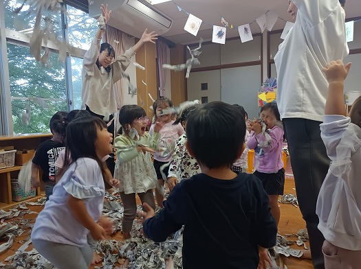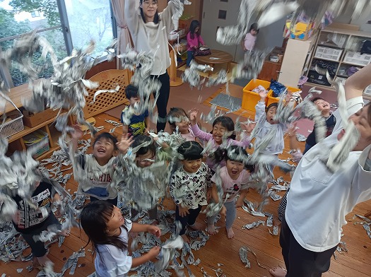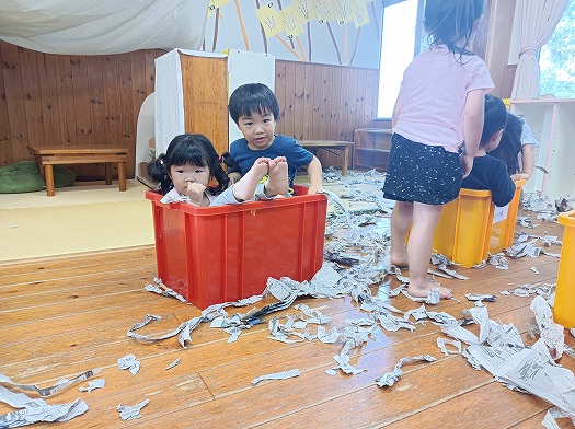 2024年10月23日 新聞紙遊び 2歳児 にじ あいにくの雨だったのでお部屋で新聞遊びをしました。 よく分かっていることも達、新聞を出すとすぐに破り始めていました。 長くやぶってみたり、小さくちぎってみたり… 思い思いの大きさにちぎっていっています。 たくさんちぎった後は、みんなで投げて楽しみました。 3.2.1.わーい わーい! その後は箱に新聞紙を入れて、新聞紙風呂を楽しみました。 2人で仲良くのーんびり 一覧へ戻る