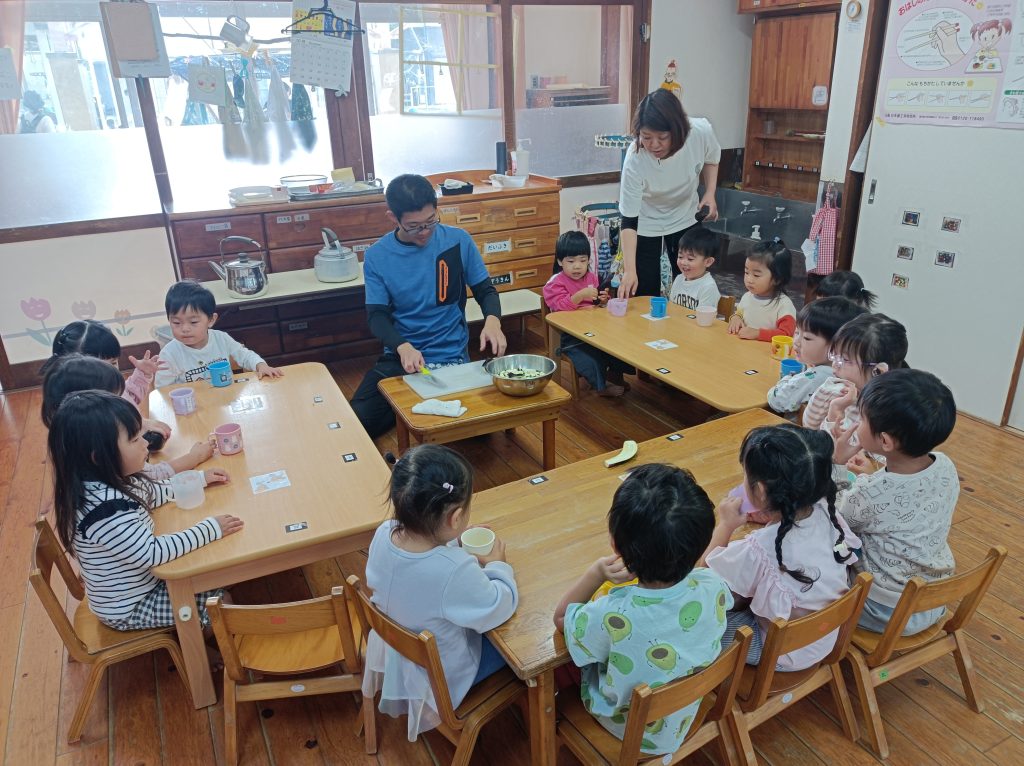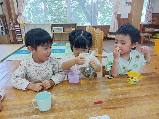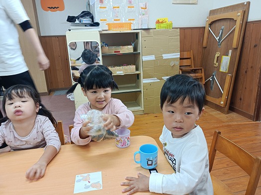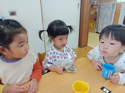 2024年10月28日 にじ組クッキング 2歳児 にじ 秋ナスを使ってクッキングをしました。 なすを触って「きゅうりみたい」「つめたいー」「かたいね」と思い思いに感想を言いながら、不思議そうな面持ちで触っていました。 切ってレンジで加熱したナスと、調味料を袋に入れてモミモミ。 (チンしている間に塩昆布の味見をしちゃったのは内緒です(笑)) 自分たちで作ったなすの塩昆布和えはとてもおいしかったようで たくさんおかわりしている子が何人もいました。 今度は何のクッキングをしようかな♪ 一覧へ戻る