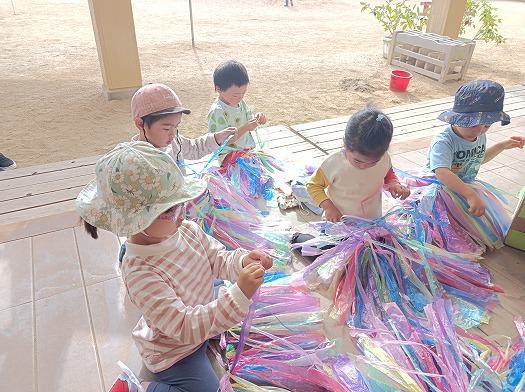 2024年10月28日 なんになるかな~ 2歳児 にじ 天気がよかったのでテラスで制作をしました。 指先を使って割きます。 難しいかな?と心配していましたが、 指先を使って上手に割いていたこどもたちでした。 何ができるかお楽しみに~♪ 一覧へ戻る