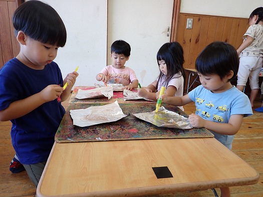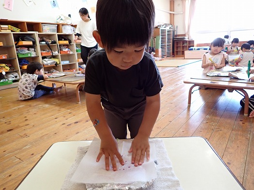 描き終わったら霧吹きで水を吹きかけて、上から紙をかぶせ、トントンと染みこませると、こどもたちは染まっていく紙を不思議そうにジーっと見ていました。