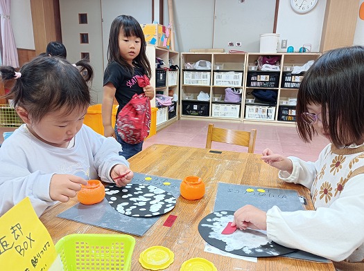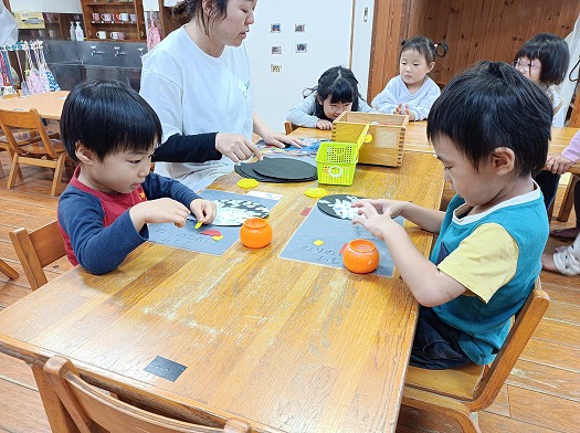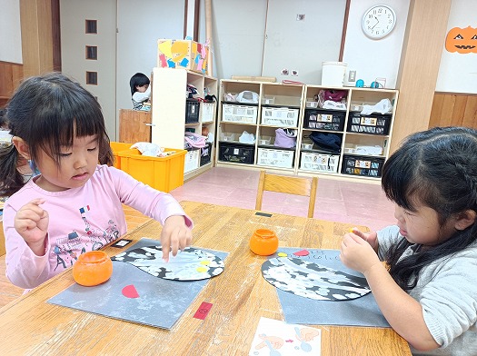 2024年10月28日 おばけだじょ~ 2歳児 にじ 以前、黒の画用紙に白色でスタンプして作った物を 保育者がおばけの形に変身させました! 自分がポンポンしたおばけにのりを使って 目と口をつけました。 何度か糊を使っているので、指先につけて画用紙に塗るという作業が、上手になっていました。 キュートなおばけがたくさんできました。 ぬりぬり~ おくちはどこにしようかな めはここにきめた ハロウィンパーティーでかわいいおばけちゃんも披露できるかな~♪ 一覧へ戻る