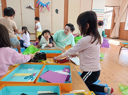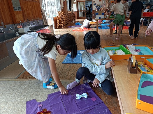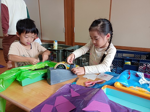 2024年11月01日 パレードに向けて② 4歳児 ほし 衣装の飾りつけをしました。 廃材やいろいろな型の紙、リボンや新聞紙など、たくさんの物があり、迷っている姿もありましたが、どのように作ろうか考えながら、飾りつけを進めていました。 新聞紙を丸めてステッキを作って、魔法をかけている子もいました。 ハロウィンパレードが楽しみです! 一覧へ戻る