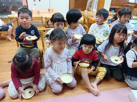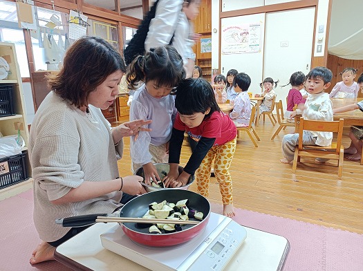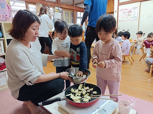 2024年10月30日 クッキング 2歳児 にじ 秋ナスを使ってクッキングをしました。 保育者が切ったナスをこどもたちがフライパンに入れました。 ごま油やだしや…調味料をクンクンと匂ってみたり。 上手に座って見ていたこどもたちでした。 おいしー たくさんおかわりをして食べていたこどもたちでした! 一覧へ戻る