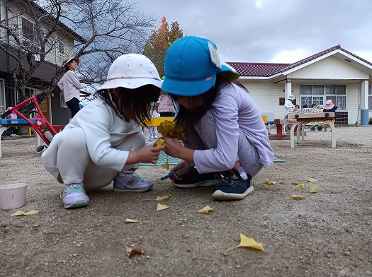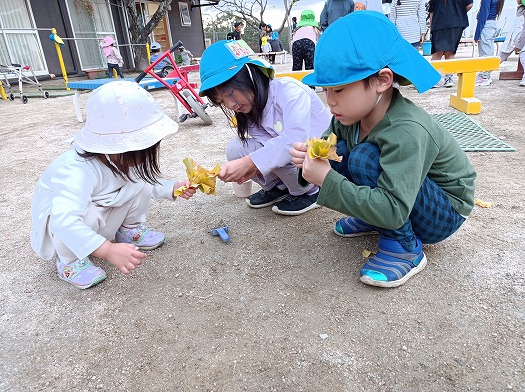 落ち葉に気付いたこどもたちが、拾ってブーケを作っていました。