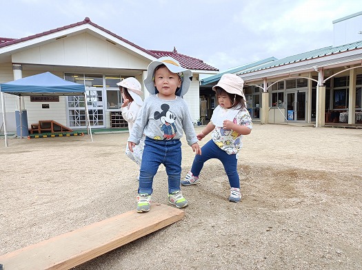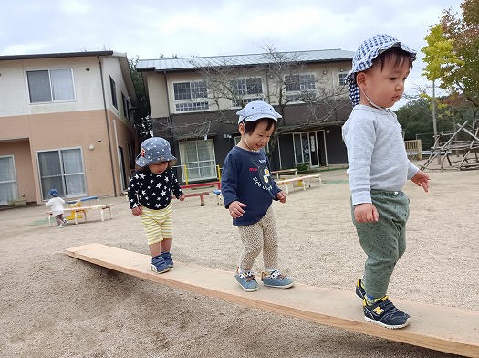 2024年11月06日 一本橋渡ろう~♪ 1歳児 ゆき 園庭の山と山の間に足場板を渡して、一本橋にしてみました。 すると、続々と橋を渡るこどもたち。 バランスを取りながらゆっくり進んだり、揺れるのが楽しくて身体を揺らしたり…。 渡るのはちょっと怖いけど、一本橋は気になる子は、周りから様子を伺ったり…。 楽しく遊ぶ中でバランス感覚や身体の使い方を学んでいるのだな~ということが、見て取れるくらい、渡るコツを掴んでいくこどもたち。 色々な経験をたくさん重ねてもらいたいな~と思っています。 一覧へ戻る