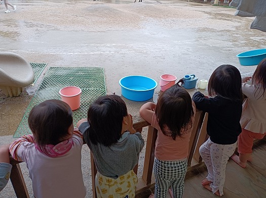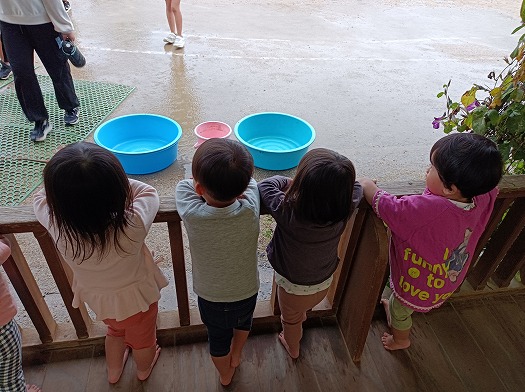 2024年11月06日 雨の合奏団 1歳児 ゆき 雨がよく降る夕方。 雨音を楽しむため、テラスで過ごすゆきぐみ。 もっと、雨の音を楽しむためには…と考えた保育者は、バケツや桶を持ってきて、雨粒に当たるように置いてみました。 プラスチックに当たって、小気味よい音が聞こえると、耳を澄ませて静かに聞き入るこどもたち。 横一列に並んで聞き入る姿が可愛らしくて、思わずパシャリ♪ こんな日は、テラスがコンサートホールに早変わりです! 一覧へ戻る