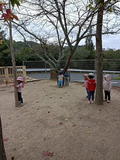 木の周りに、こっそりと隠れているこどもたちを保育者が発見。
