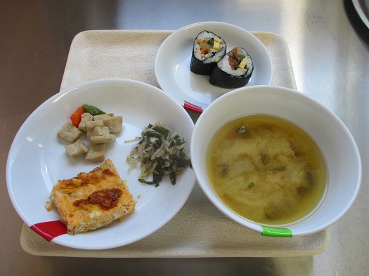 2024年11月13日 給食室(11月11日の給食、おやつ) 給食室 昼食 ・ごはん ・千草焼き ・高野豆腐の煮物 ・もやしの酢の物 ・きのこのみそ汁 おやつ ・キンパ 和食でしたが、よく食べていました。 今日の旬の食材は”きのこ”で『きのこのみそ汁』でした。 おやつは『キンパ』でした。 韓国の食事で、ごま油と塩で味付けたご飯を海苔でまいたものなのですが、 具材はいろいろあるそうです。 人気でした。😊 一覧へ戻る