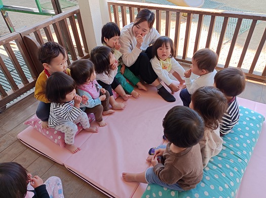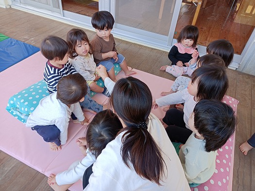 マットクッションに仲良く座って、誕生会で歌う「おなまえなーに?」の歌を一緒に歌うこどもたち。