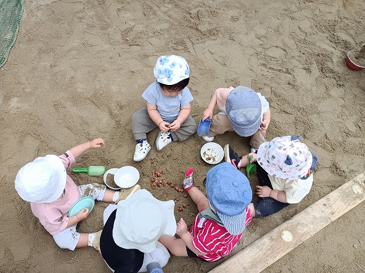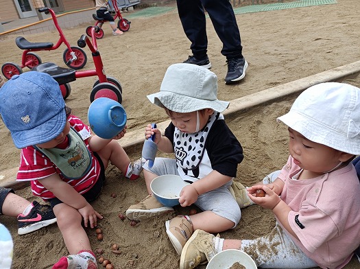 2024年11月13日 どんぐり 0歳児 はな 散歩先で見つけた、どんぐりを使ってあそびました。 砂の上にどんぐりを散らばすと、スコップですくって自分の持っている容器にいれたり、砂をすくってどんぐりにかけて隠したりしていました。 夢中であそんでいる姿がかわいいかったです。 一覧へ戻る