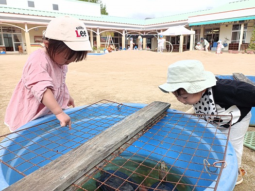 園庭にいるカメをみつけると頭をさげて覗き込んで見たり、手を振ってカメに挨拶をしたり。
