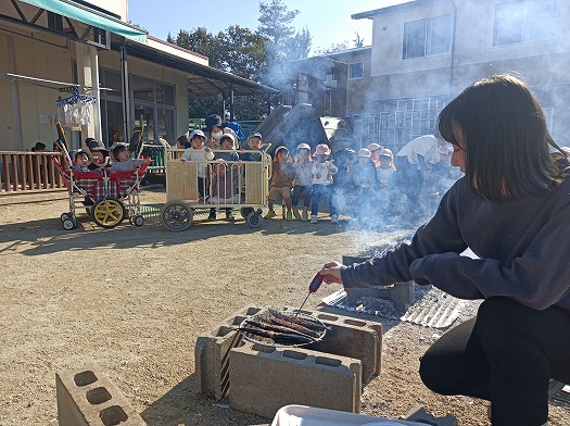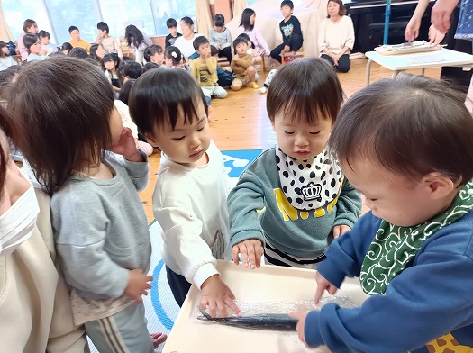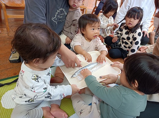 2024年11月21日 美味しかったね 0歳児 はな サンマキャラバンに参加しました。 美味しいサンマの見分け方やサンマを食べると頭が良くなる話などを聞いた後、本物のサンマを触ってみました。 優しくちょんちょんと触り、初めての感触に驚いていたり嬉しそうに何度も触ったりしていました。 七輪でサンマを焼いている所をみにいくとじっと見ていました。 焼きたてのサンマを食べると美味しかったようでニコニコしていました。 一覧へ戻る