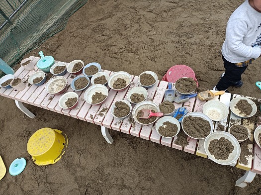 砂場にポツンと置いてあるベンチに、ふと気が付くとお皿がずらっと並べてありました。