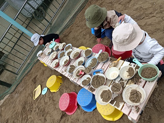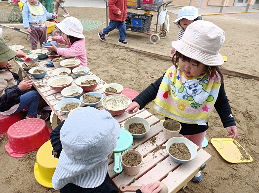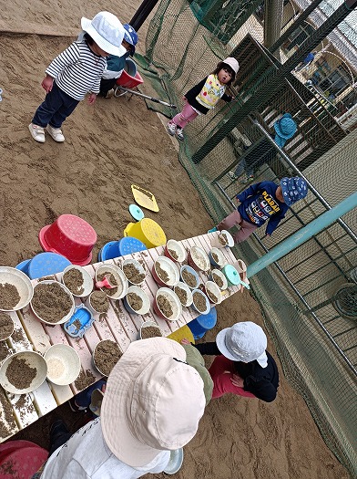友だちに話しかけながら、お皿に砂を詰めたり、食べる真似をしたり。
