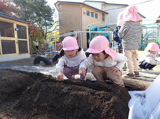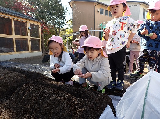 2024年11月21日 大きくなあれ! 3歳児 つき カブの種を植えました。 植える前に「この種は何でしょう?」「白い野菜だよ」などと質問してみると、「ピーマン」「トマト」「白い野菜」「大根」などと面白くて惜しい回答がたくさんでてきました。 すごく小さい種だったので、「落としてしちゃった…」という事もありましたが、大きくなってほしい思いを込めてみんなで植えることができました。 こどもたちの気持ちが届いて大きくなってほしいなぁ、、 一覧へ戻る