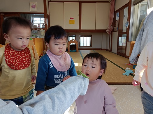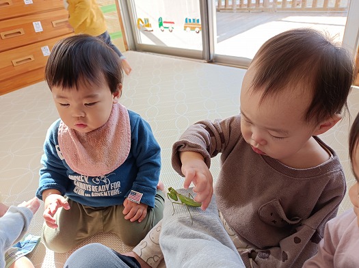 2024年11月25日 未知との遭遇 0歳児 はな はなぐみテラスに大きなカマキリがいたので、捕まえました。 少し警戒をしながらもカマキリに興味津々。 最初は怖がっていた子も保育者が触っている様子をみると、ツンツンと触っていました。 観察し終えると、みんなで「バイバイ」とカマキリを外に逃がしました。 一覧へ戻る