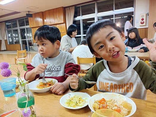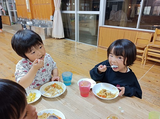 2024年11月26日 お泊り保育⑥ 4歳児 ほし 無事にカレールーをゲットして保育園に戻ると 「河童に会ってカレーのルーをもらった!」「どうして河童はきゅうりじゃなくてカレールーが欲しかったのかな?」「これでカレー食べれるね!」等、子どもたちの間で楽しい会話が聞こえてきました。 おいしいカレーが完成してみんなで一緒に「いただきます!」 自分たちで作ったカレーは特別です。 おいしい!とたくさんおかわりする子もいました。 一覧へ戻る